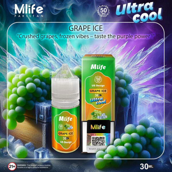 Mlife Ultra Cool Grape Ice is a 50mg nic salt e-liquid blending juicy grape, candy sweetness, and icy menthol in a smooth 50/50 VG/PG mixMade in China, it’s ideal for pod vape users who enjoy a cool and fruity vape.